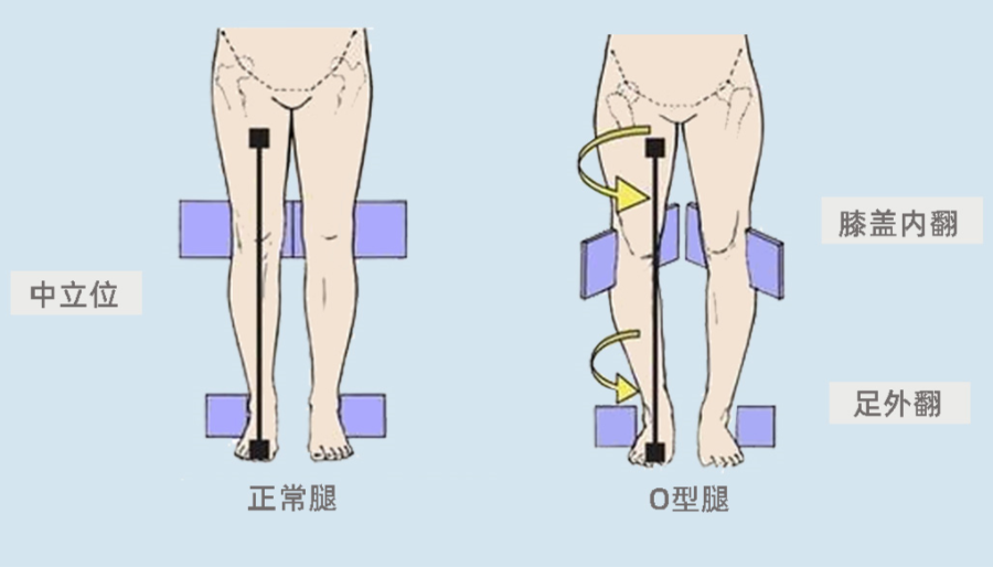 ② O型腿 O型腿由于膝关节内翻、足外翻,走路常表现为“外八字”,导致足底外侧受力居多。