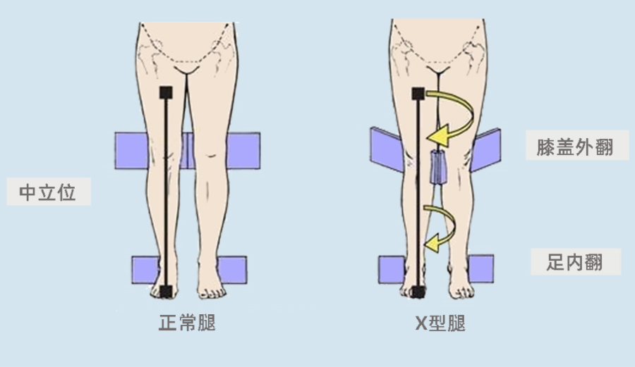 ② X型腿 X型腿的朋友,膝关节的角度是向外翻的,向下影响足底,通常表现为走路“内八字”,足底内侧受力更多。