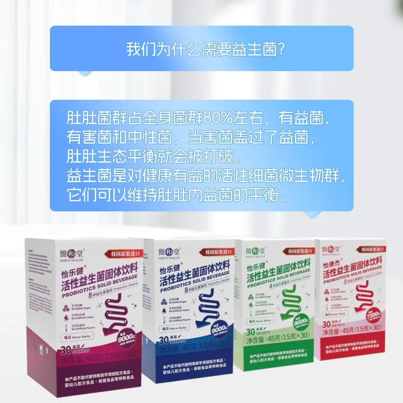 简和堂给益生菌添加的益生元甚至不止一两种,就算益生菌挑食也不会饿着啦,够支撑它们生存和繁衍,肠道菌群就平衡起来了。