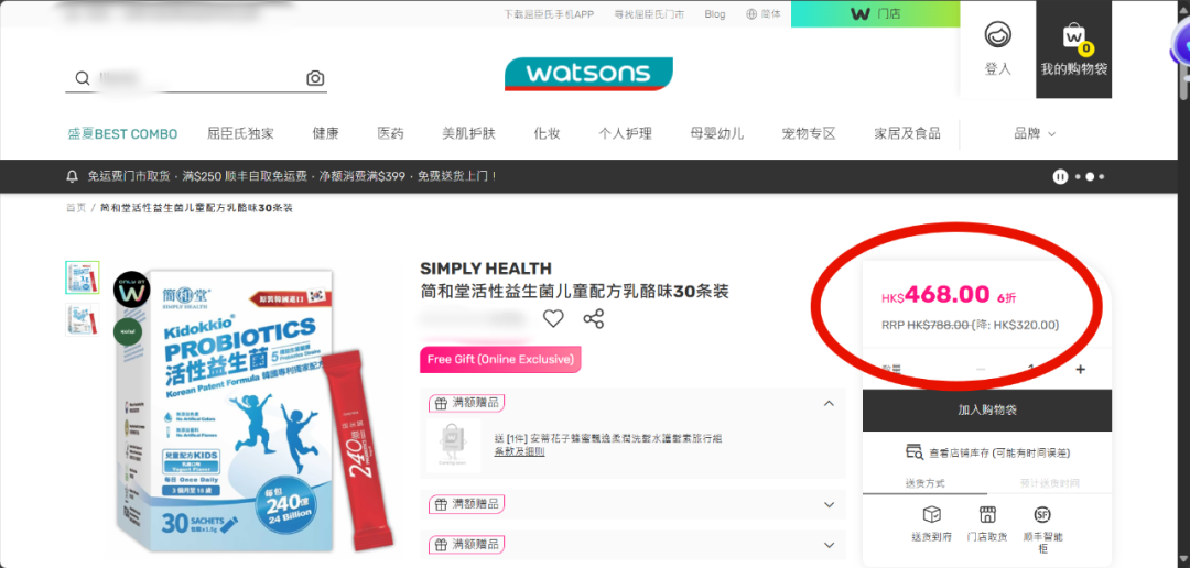 香港屈臣氏原价788港币,活动在售也要468港币(汇率折合人民币大约为430元1盒,30条装)!