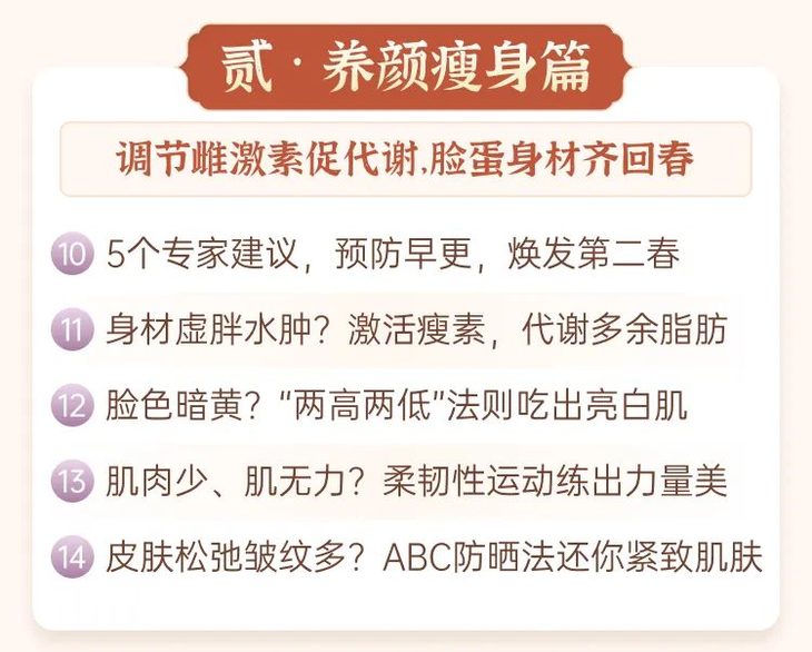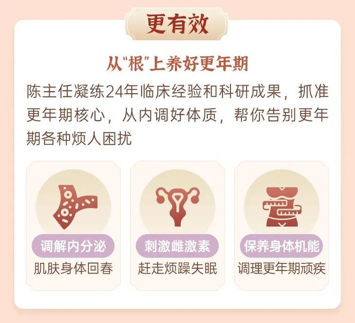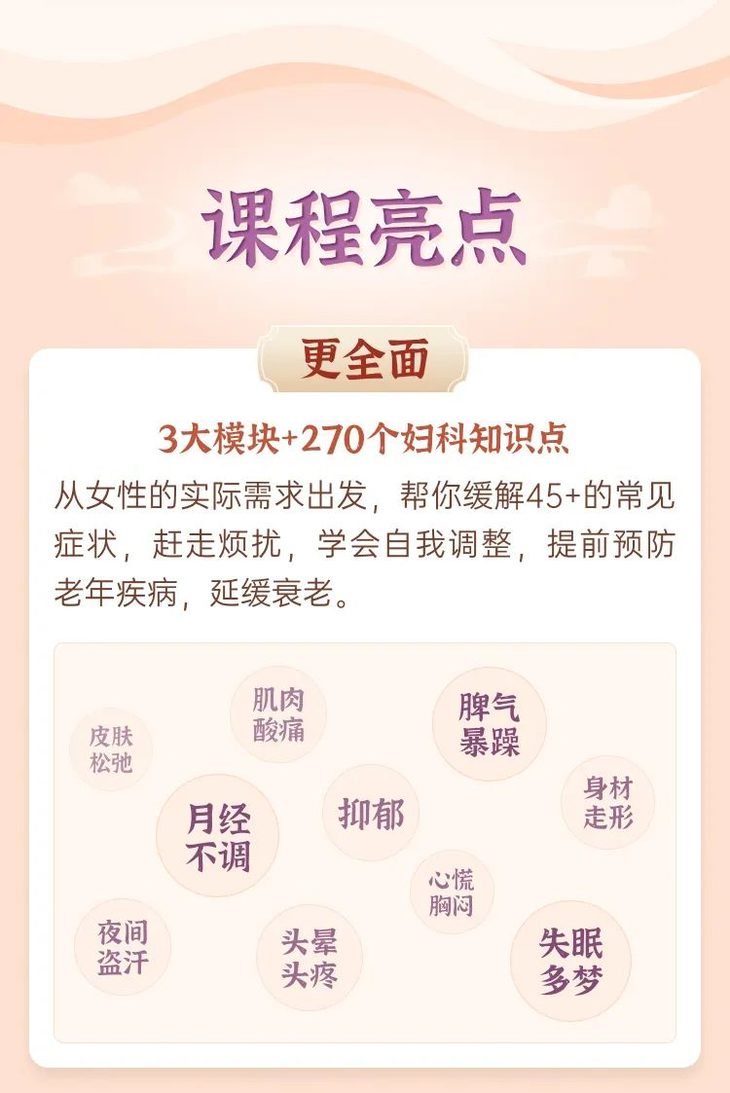 强大专业造诣的她,还出任了中国医药教育协会生殖内分泌专委会副主委,中国医学科学院青年教师联盟理事长。由于医学水平极为专业,治疗方法简单有效,她还荣获了“人民名医”证书。还多次受CCTV、腾讯等媒体邀请,为全国女性科普妇科知识、保养学问。因为够专业,陈蓉老师的挂号费,仅电话问诊都高达600块。但她却希望更多女性,可以自己调节雌激素分泌,保持青春美丽,延缓衰老,避开更年期带来的痛苦,而不是等生病了才花钱求医。现在很多女性工作压力大,经常加班熬夜饮食不规律,又缺乏运动,心情时常郁闷不堪,雌激素不失调都难,甚者更年期还会提前到来。光是健忘、情志失常、烦躁易怒这几点就已让人闻风丧胆,再加上头昏耳鸣、心悸失眠、潮热出汗、口燥咽干、胃呆纳减……一系列更年期会出现的症状,可想而知,更年期女性情绪多易燃易爆!但事实上更年期不是疾病或缺陷,甚至不是个症候群,只是女性生活了四五十年的自然结果。更年期在医学上称“围绝经期”,指卵巢功能从旺盛到衰退再到完全消失的过渡期,一般以1年无月经作为绝经标志,常发生在45——55岁。如果没严重影响生活,可以平稳度过。但真正可怕之处在于,平均只有15%的人可平稳渡过更年期,剩下85%的人,均患有不同程度的更年期综合征。如月经紊乱、骨质疏松、腰背疼痛、尿失禁、潮热盗汗、心血管疾病、心悸易怒、烦躁健忘、焦虑抑郁等症状。这些症状可能持续到绝经后2~3年,或5~10年才会有所减轻或消失。据世界卫生组织预估,到2030年全球将有12亿以上更年期妇女,我国更年期女性将超过2.1亿,占总人口的1/7。如果按2.1亿的85%粗略推算,那么中国有1.8亿人正在经历更年期综合征的折磨。这些人中,可能就包括你,或家里其他长辈。但事实是,很多女性因不懂它的重要性,忽略身体发出的警告,加速衰老……因此,陈蓉医生一直反复强调:“安抚好雌激素分泌,美丽自然来”。目前为止,陈蓉老师已经帮助100000+学员调节雌激素分泌,抗住了衰老态。更年期后脸暗沉长皱纹,头发大把大把掉,以前不懂,一直吃阿胶和买几千块护肤品保养,不仅没变美,还疯狂爆痘。听了陈医生的课,才发现是雌激素失调惹的祸。跟着老师调整饮食和习惯调理,皮肤变得水嫩白皙,基本不掉头发了,现在总有人夸我看起来很年轻。迈入49岁,不仅身体精神差,肚子还长了一圈肥肉,节食吃减肥药都不见效。现在开始调理雌激素,跟着陈医生学怎么健康吃,健康作息,现在腰瘦了2个尺码,身体精力变好了,心情也格外好。李阿姨已2年没来月经,绝经后刚开始有时关节疼痛,只是不明显,所以没在意。但6月来,李阿姨动不动就大汗淋漓、忽冷忽热,到现在严重影响睡眠了;原来李阿姨的这些身体不舒服,是由于卵巢功能衰竭导致的更年期症状。李阿姨根据陈医生的课从健康饮食、保持良好生活习惯、适当锻炼,并配合药物治疗,把更年期健康管理起来,提高生活质量。1个月后,多汗、忽冷忽热的症状基本缓解,之前的关节疼痛也减轻许多。更重要的是,晚上睡得更踏实更香了,白天也恢复之前的好状态,脸上荨麻疹痘痘消失,皮肤光滑细腻。你瞧,变美其实很简单,方法对了,更年期也可以活成青春期。但无一例外,她们都在陈蓉医生的指导下,用一些简单的办法,就变美了。不需要昂贵的肤护品,也不需要去美容院办卡,更不需要花钱受罪做手术。如果你想在5年后、10年后,比同龄人更年轻,更健康,我强烈将这套《18堂更年期调养术》推荐给你。23年的医学诊治经验和保养秘笈,总结270多条知识点,涵盖所有难点,使女性通过简单检查,就能判断自己的身体状况,从原因分析、预防方法到实操解决,一看就懂,一学就会。只需花一顿饭的钱,即可把协和名医请回家,让自己从根源上瘦出美人脸,养出好气色,调出好肌肤。不论你对更年期,对冻龄,还有哪些问题,都可以通过陈蓉教授的课找到答案。而现在,你不用苦苦排队挂号,也不用高价找黄牛,就能解锁协和名医亲授的“女性健康宝典”,为整个家庭的幸福保驾护航!爱自己是终身浪漫的开始。女人,最需要学会的,是爱自己,给自己足够多的关心。只注重外表的抗衰和保养是“治标不治本”,一堂好课带你掌握保持年轻的真正核心。