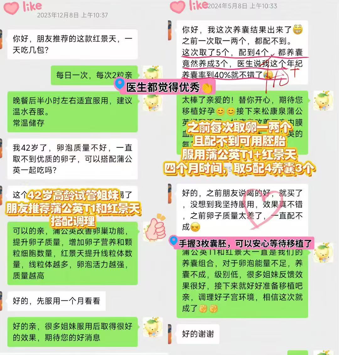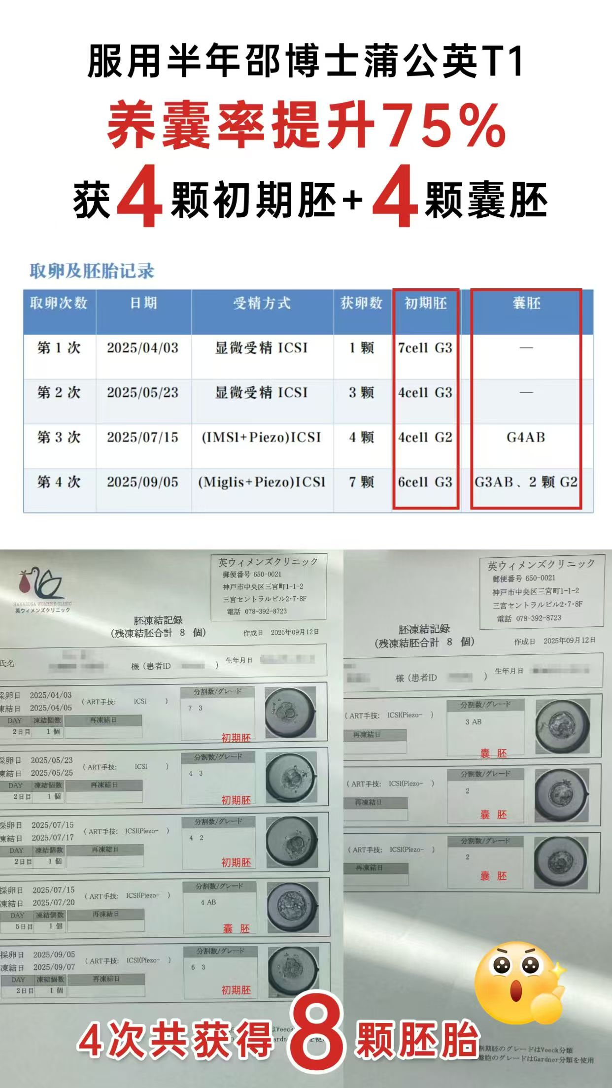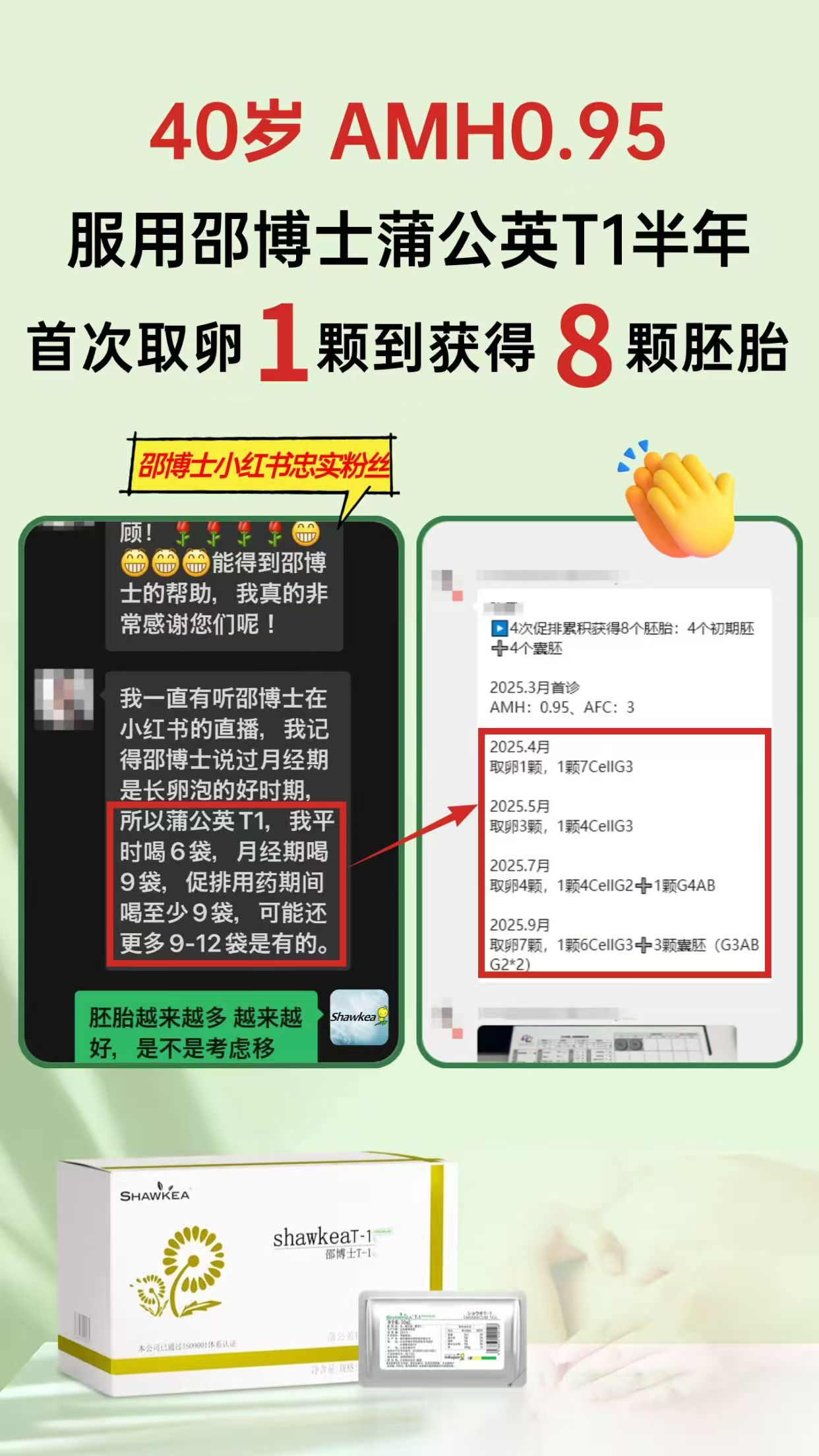 对年龄在35岁以上、AMH低、卵巢储备下降、多次取卵仍未能获得高质量胚胎的患者,建议在IVF治疗中同步持续服用ShawkeaT-1蒲公英口服液,取卵前服用3个月最佳。