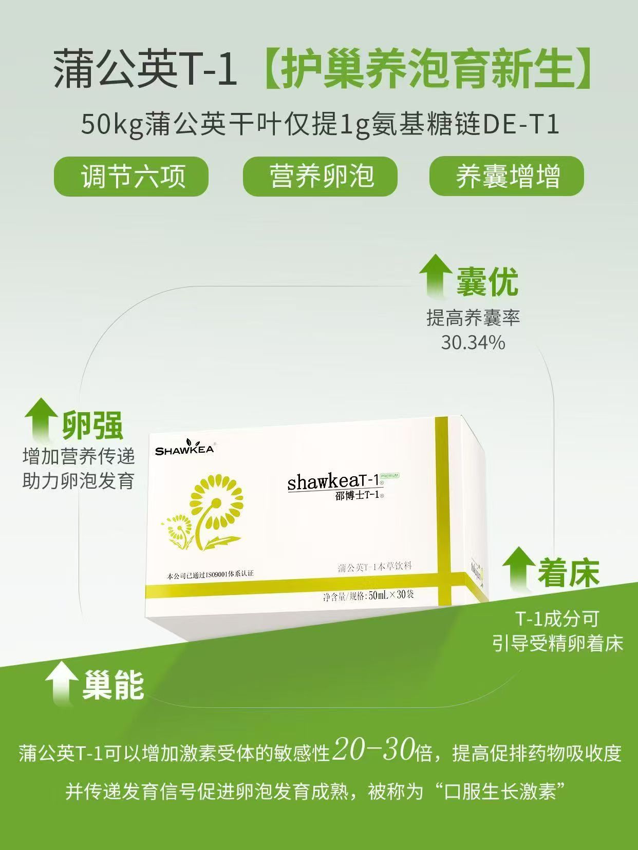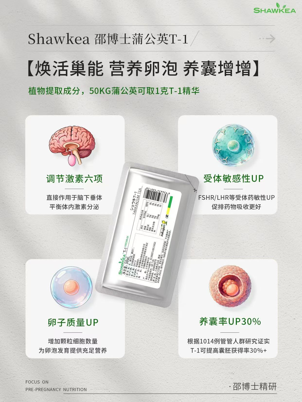 Shawkea T-1 由著名医学专家邵辉博士从中药类植物蒲公英中提取的一种氨基多糖复合物,在循证医学的领域,经过26年不断的研究和临床实际患者的使用,临床数据证明,「T-1对于高龄、卵巢功能差的女性卵巢功能和妊娠率的改善具有很好的效果。」