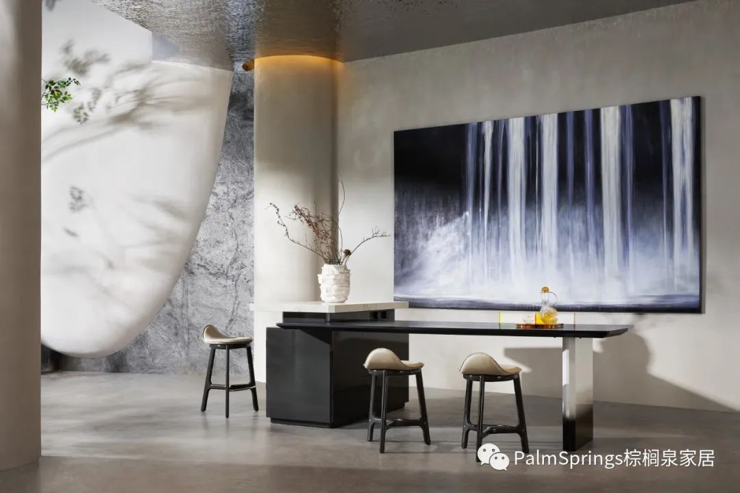 多功能岛台与餐桌连成一线,拉宽用餐空间却拉近家人距离,将烹饪区与休闲区。合并的设计理念以环抱之姿和微斜椅脚给予温暖舒适的用餐氛围,墨与白舒适治愈,宽大桌面和柜体满足收纳与操作需求,简洁现代的设计,方寸之间尽显质感与优雅。