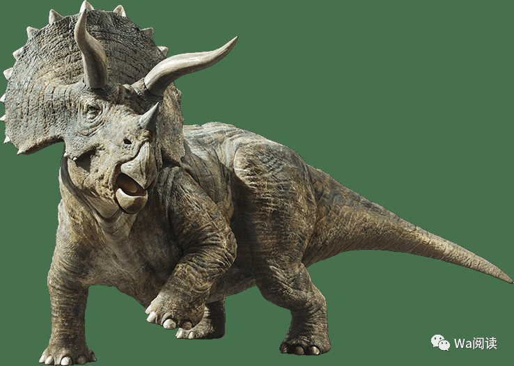 (三角恐龙有三个尖角,一个在鼻子上,另外两个各在两边眼睛处。一个很大的像扇子一样的骨头保护着它的脖子。)