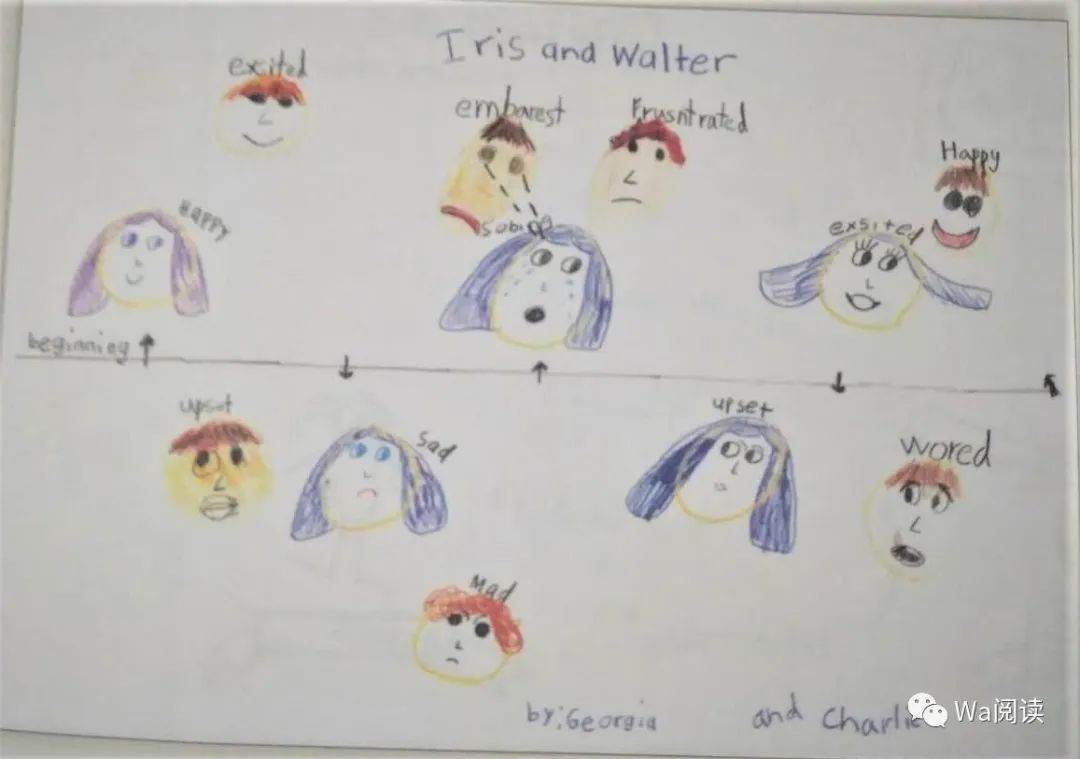 最后把书籍里人物的情感变化以轴线方式画出来,并配上发生的事情。这样孩子就学会梳理故事脉络,训练了根据现象去推测本质原因的能力。