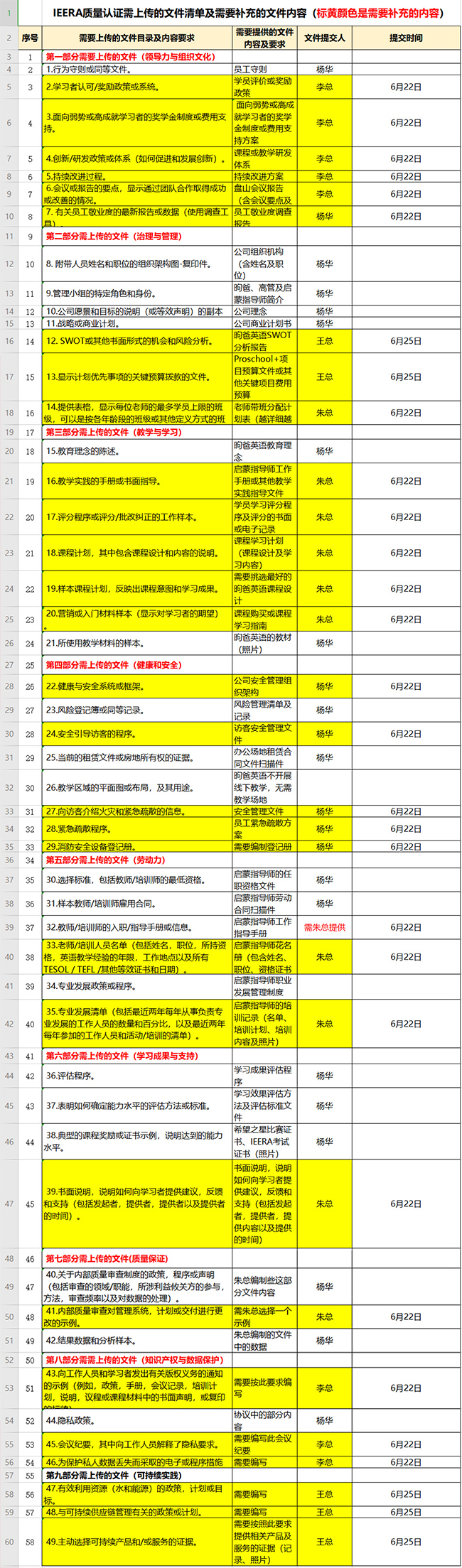 以上为英文提交材料的相关说明的原文,翻译过来,就是在这份巨大的全英文申请资料里,要求申请机构在以下49个方面提供非常完备的体系文件。昫爸英语内部要求相关负责人提交文件的时间节点: