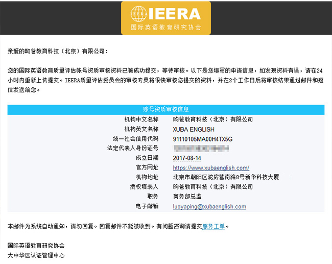 9月15日,昫爸英语项目组首先提交了机构资质审核申请。9月19日收到IERRA通知,昫爸英语机构资质审核已通过,可进入质量评估阶段。
