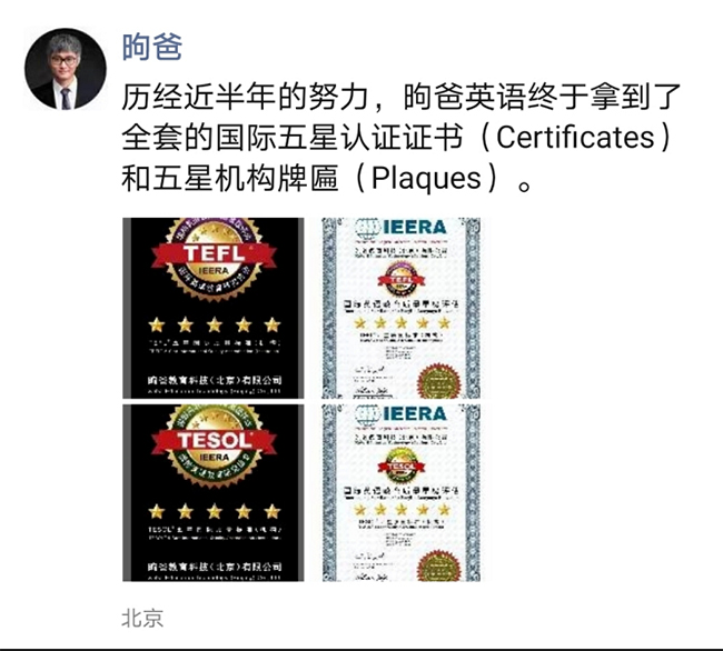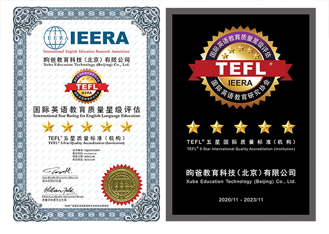 2020年11月6日,昫爸英语通过IEERA专家组三重严苛审核与质量评估,由IEERA审核员、审核主管及审核委员会主席William Feld分别确认签名,授予昫爸英语TESOL和TEFL黄金五星顶级认证!