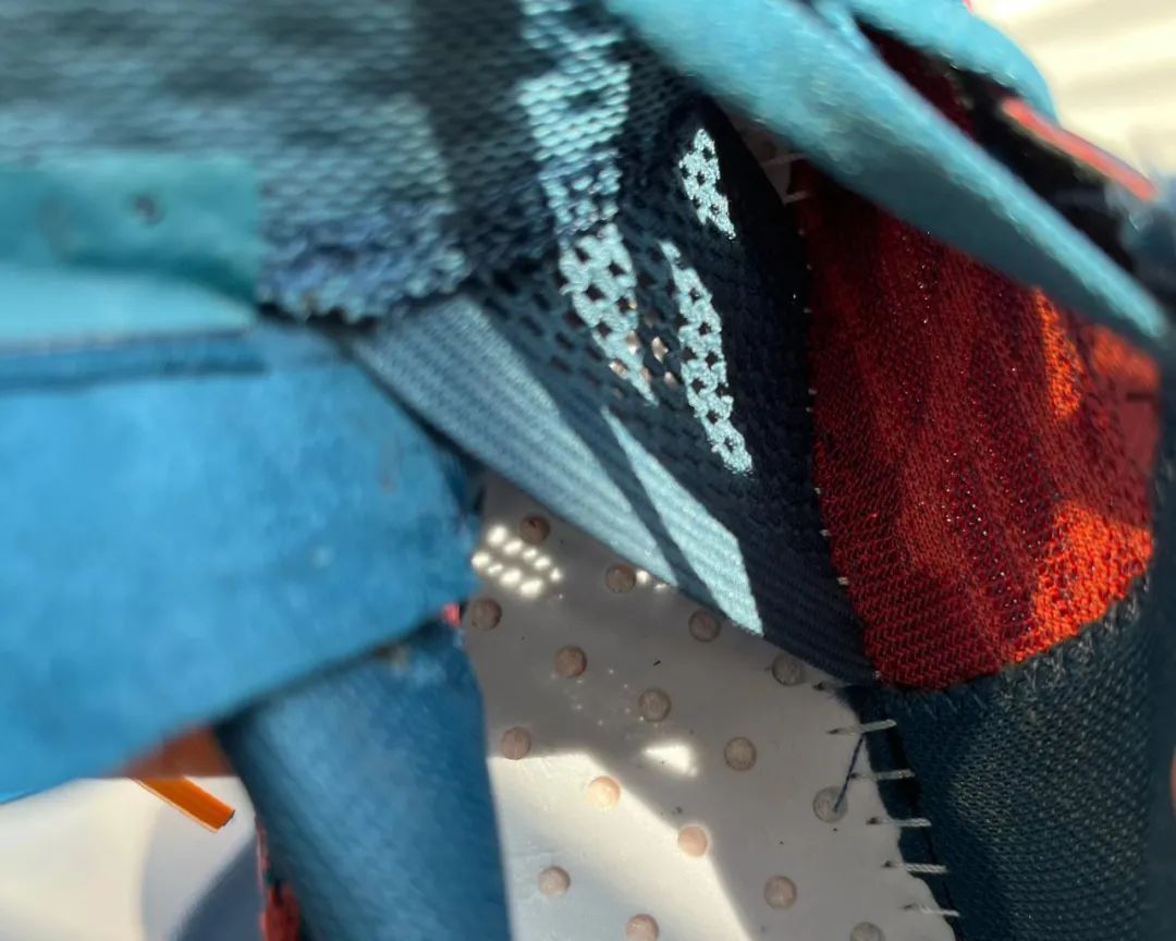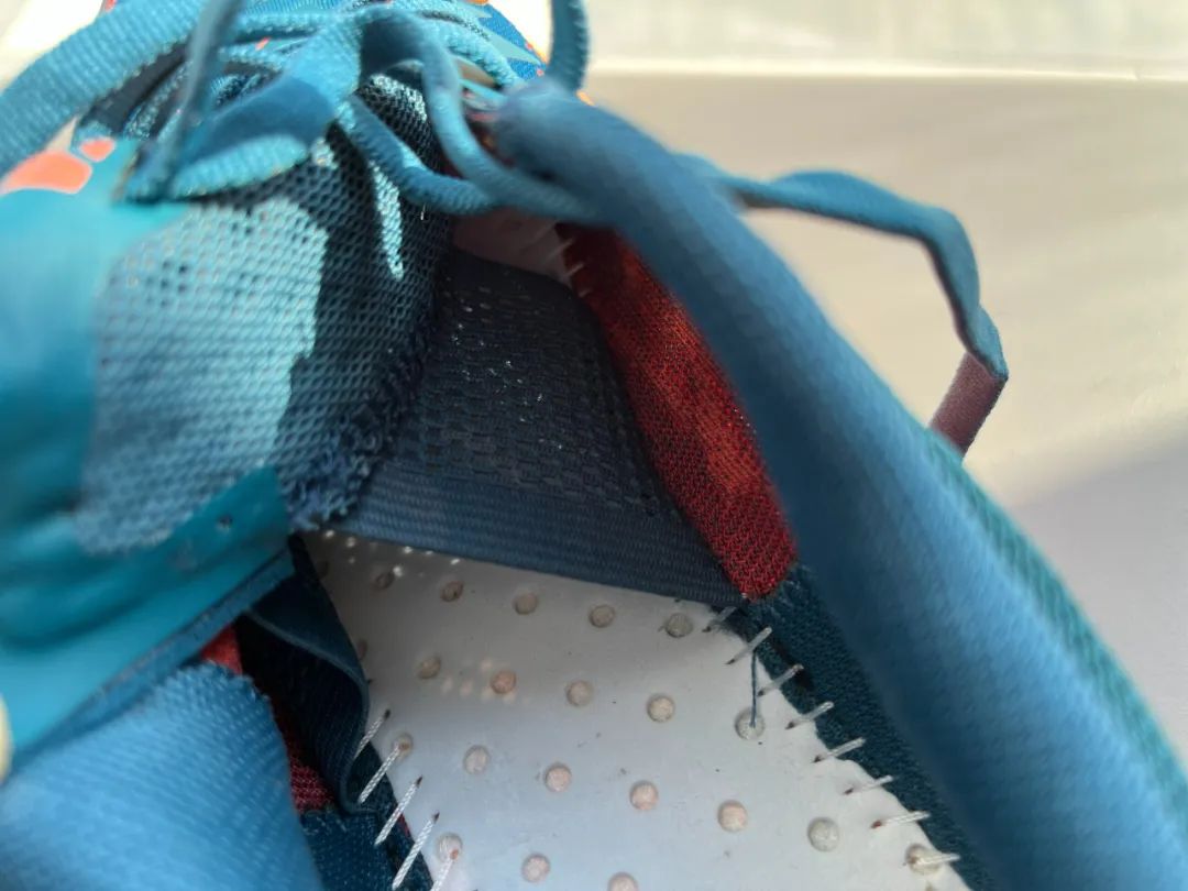 后跟上沿贴近脚踝的一圈使用的是工程网纱和纱布做拼接,目的是减少整体鞋重。