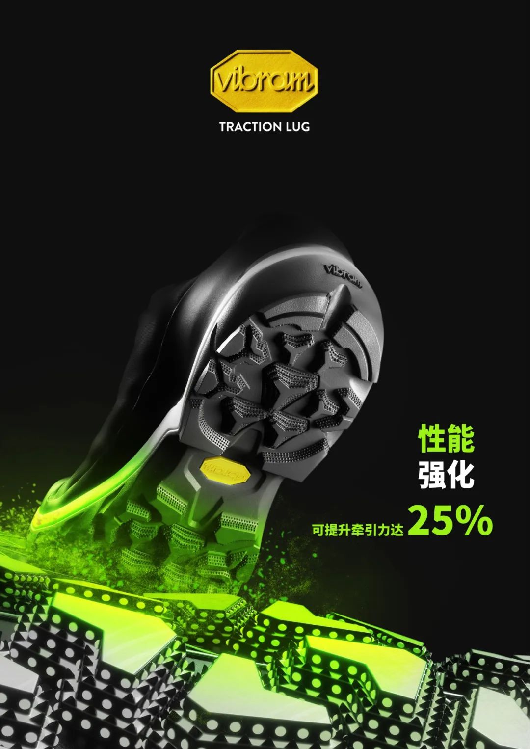 Vibram的官方说法是,在不增加整体鞋重的前提下,最大可增加50%的接触面积、提升25%的抓地力。
