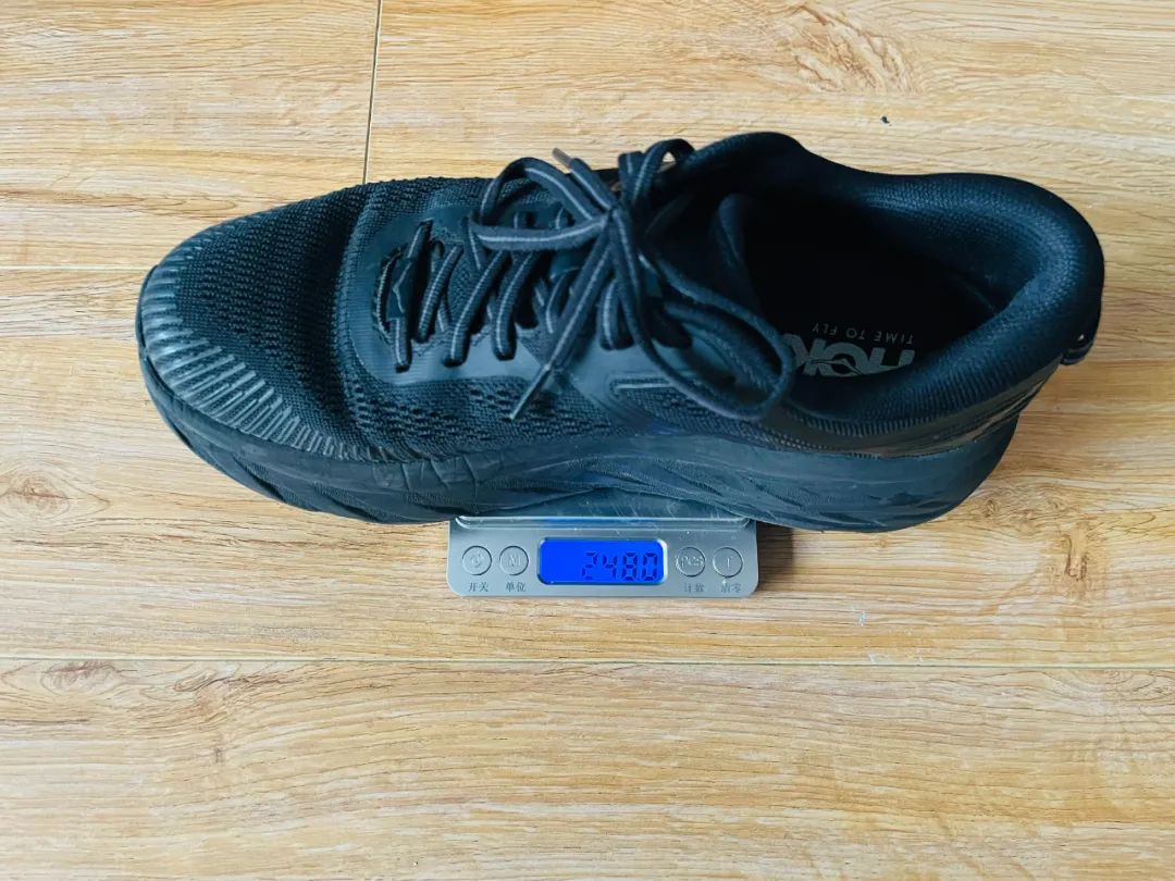 我还测了HOKA的路跑鞋做对比,同尺码的Bondi 7女款7码重量为248g,前后掌高度也是27mm和31mm,但大底并非Vibram橡胶。