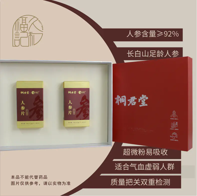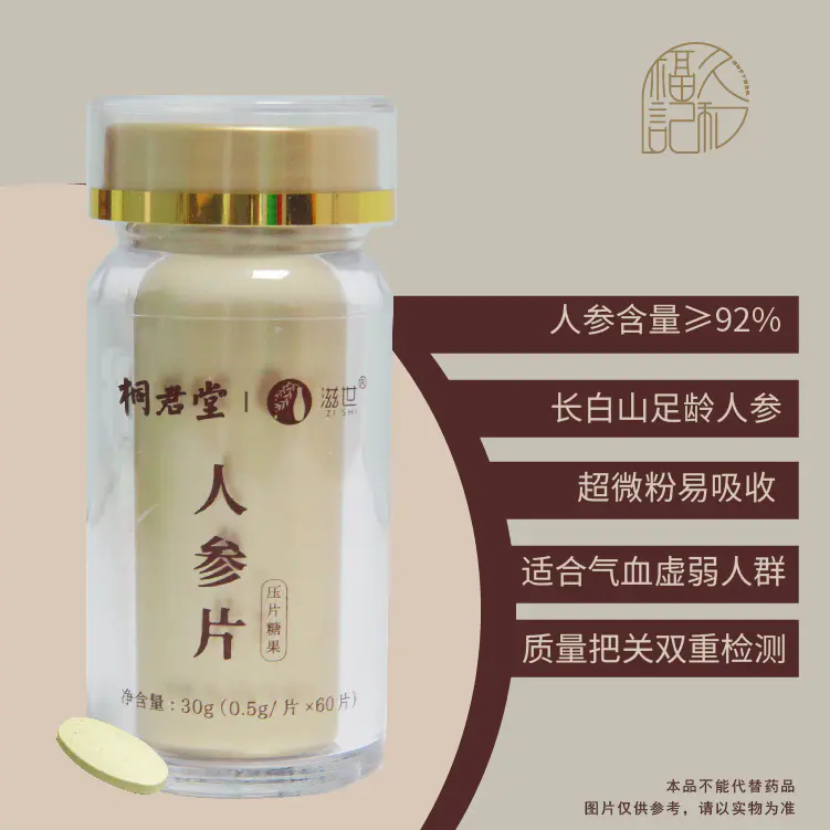 选长白山道地足龄人参,超微粉碎压制成片,人参含量高达92%,人参皂苷含量高,含在嘴里,有一股浓郁的参味涌上心头。加班熬夜含上一片,方便携带,食用简单,特别适合气虚乏力的人群。