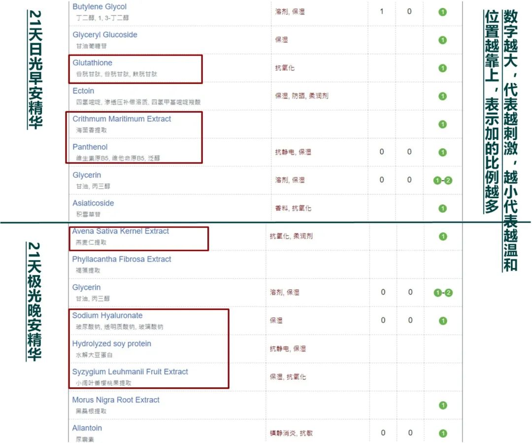 真的好久没见过通篇都是绿色评分的表格了!我截取了主要成分给你们,加了超多保湿、消炎、抗氧化的天然植物提取物~▼