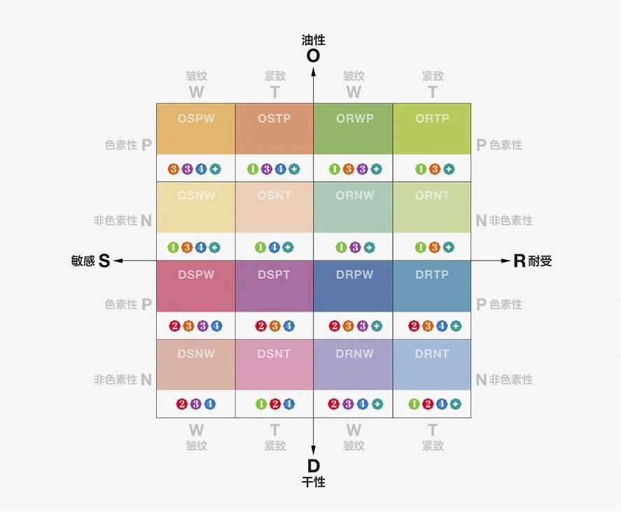 以上四个维度都是肤质的决定因素:干性还是油性,耐受不耐受,敏感不敏感,以及是否容易色素沉淀,是否容易长皱纹。根据这四个维度,鲍曼医生把皮肤做了那么多详细的分类。