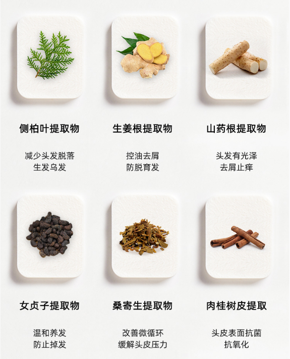 我们再来看看它所含的成分,都是从这些草木中提取的精华,在保证头发清洁的基础上,呵护发根,润养毛囊。