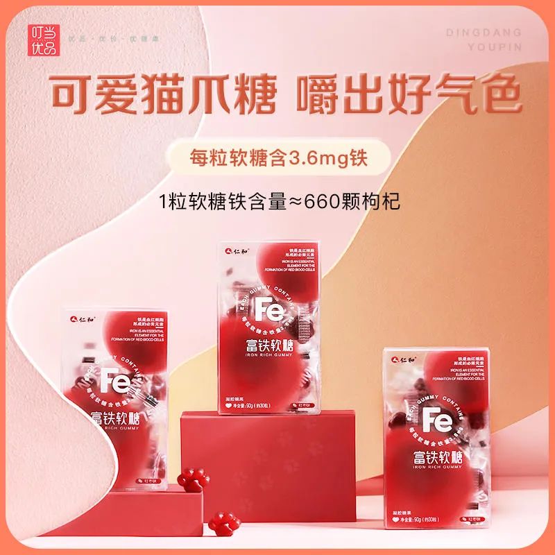 仁和富铁软糖,每颗软糖含有3.6mg铁,一颗软糖所含有的铁≈660颗枸杞的含量。