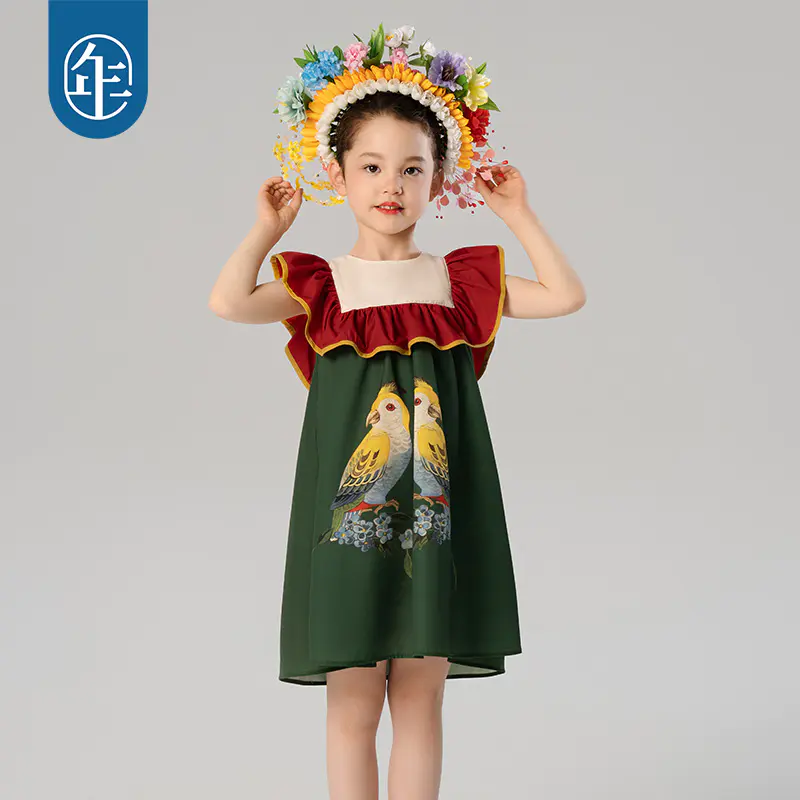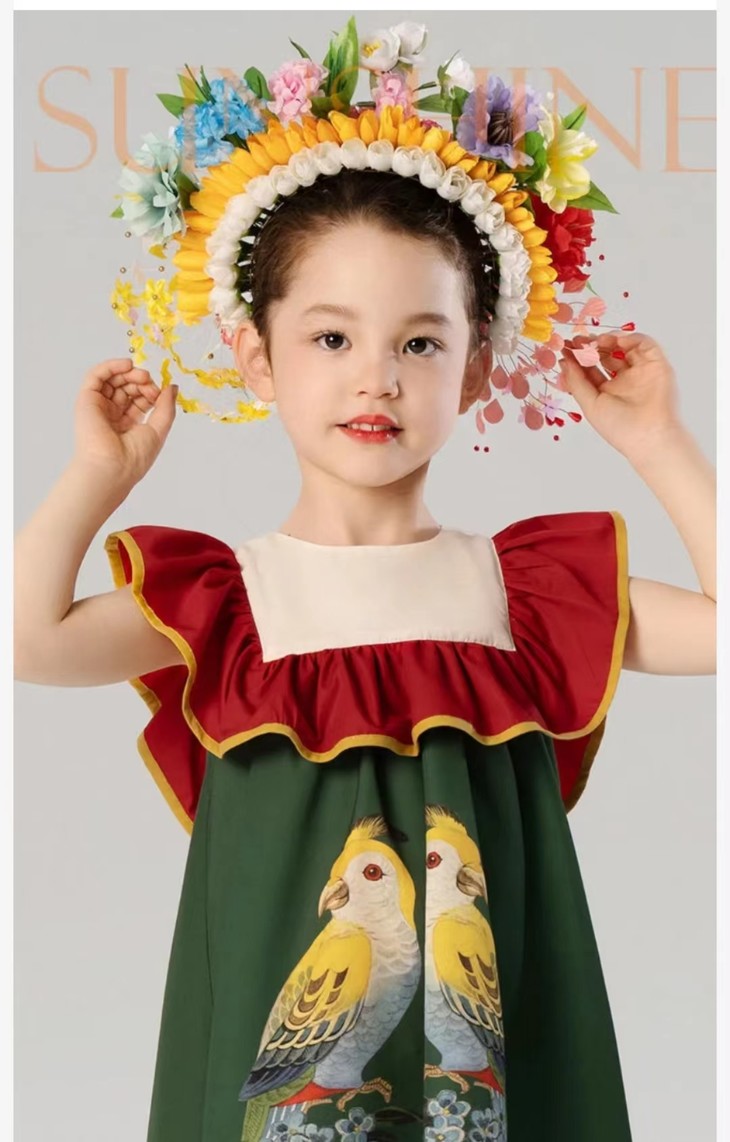 下面这款是鹦鹉吊带连衣裙,设计灵感来源是东方奇幻世界,鹦鹉取义喜心美满。设计配色采用经典大撞色,突出亮眼。
