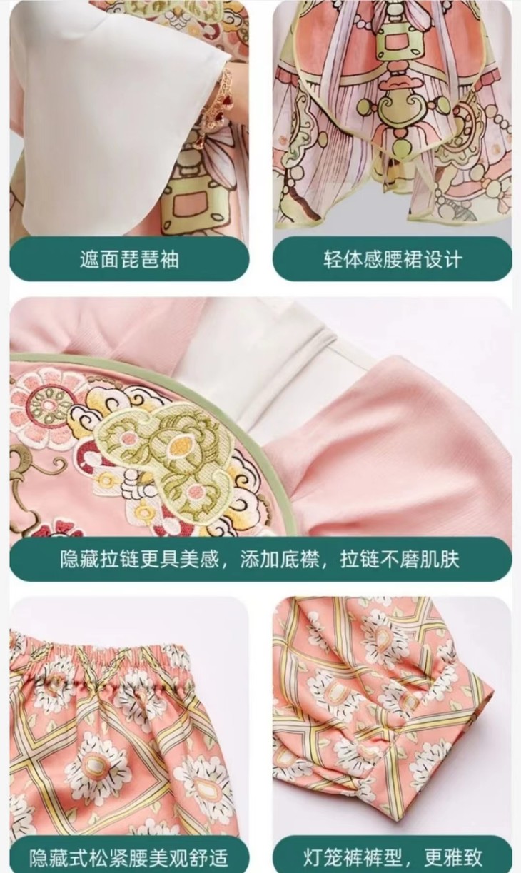 这款设计解锁分体穿,上衣下裳的结合国风连衣上衣+中式防蚊裤,下裳的面料轻薄密织,避了阳光直晒裤脚采用束口设计,防止春夏的蚊虫叮咬和晒伤,直接穿上不用繁琐穿搭就可以完成美美暴击!