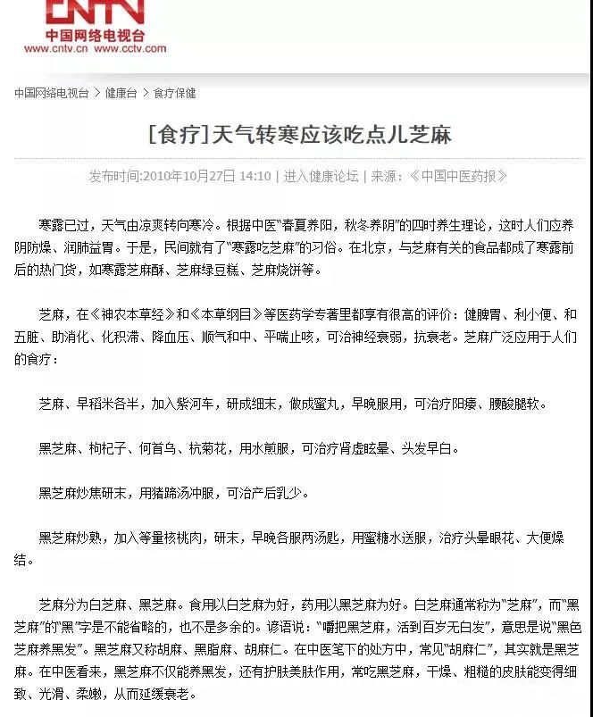 黑芝麻有补肾乌发的功效,中医认为“肾其华在发”,CCTV《探索发现》也在《一饭胡麻度几春》节目里详细指出了黑芝麻丸的功效、历史和做法。