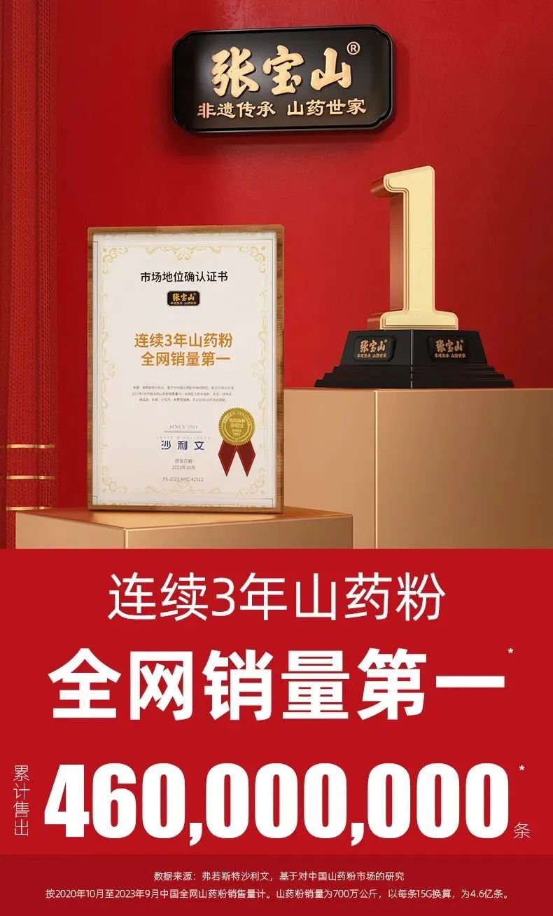 张宝山连续3年山药粉都是全网销量第一,累计售出 460,000,000条山药粉。