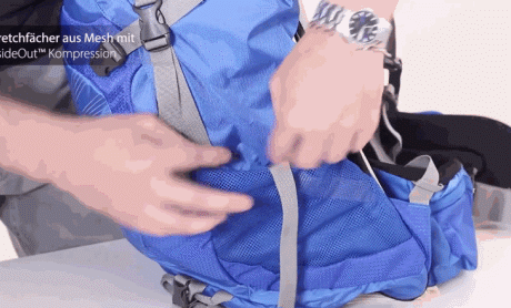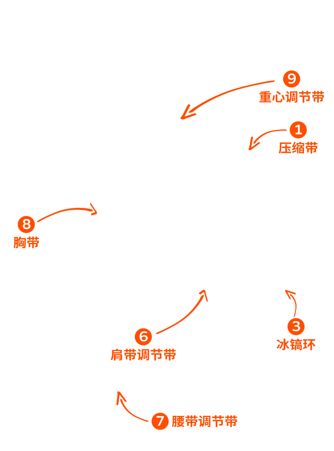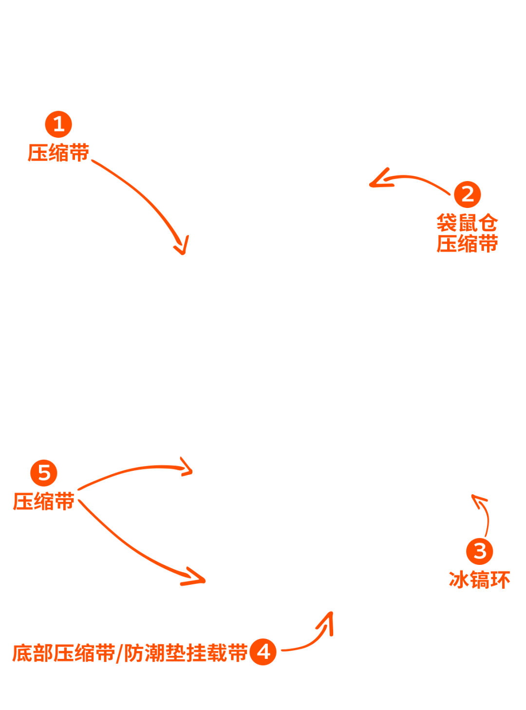 ⒈压缩带(Compression strap)-拉紧压缩带,可以压缩空间、压紧和稳定负载,确保重心靠近背部,也可以用于将物品固定在背包的一侧。
