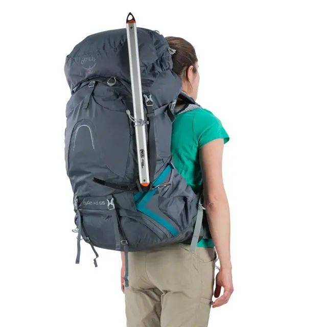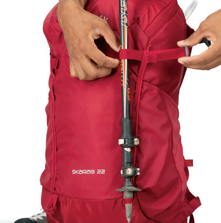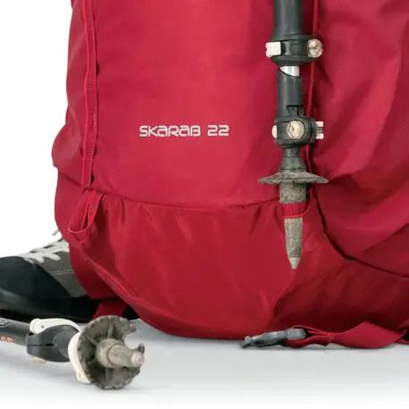 对于一些非重装包,挂载登山杖的位置在包体正面,例如SKARAB甲虫: