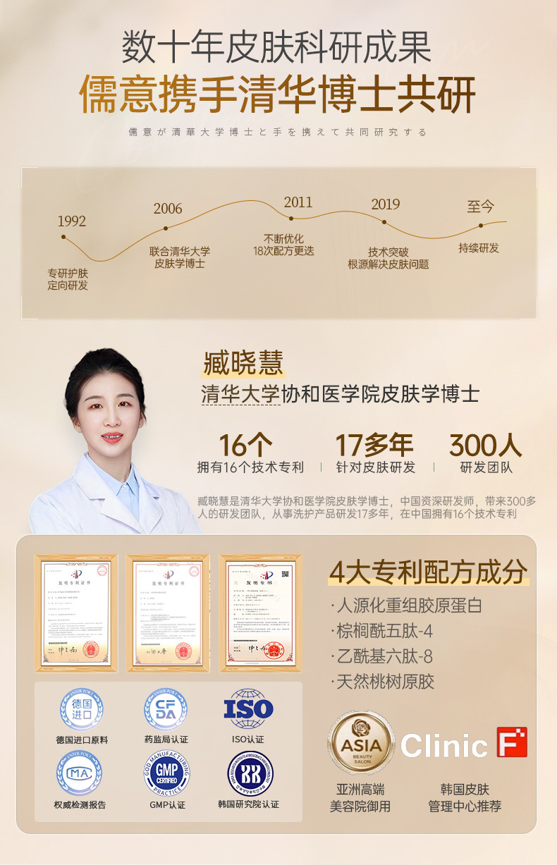看它这么好用,我本来还有些忐忑,但查了才知道它不仅是清华大学协和醫学院皮肤学博士耗时十多年研发而成,还有多家醫院合作専研成分,内含4大専利成分直击法令纹!