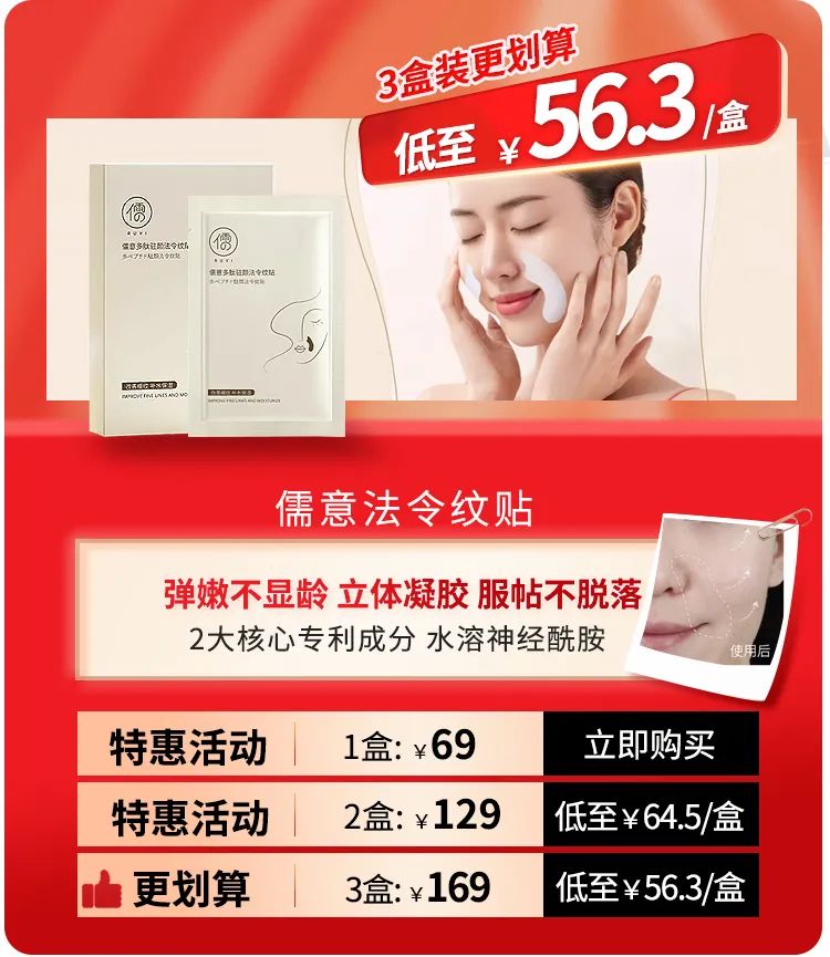 有这么强大的背景,实力也肉眼可见,还有什么不放心的呢?所以这次,小编也把这款儒意·法令纹贴分享给大家,还争取到了粉丝福利价:每盒20片(10对),1盒69元,2盒129元,3盒169元,低至56.3元/盒!