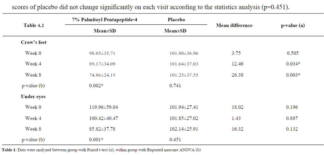 一项发表于《國际化妆品科学雑志》的研究表明,含有棕榈酰五肽-4的面霜在使用4周后,受试者皮肤的皱纹深 度显著减少。[1]