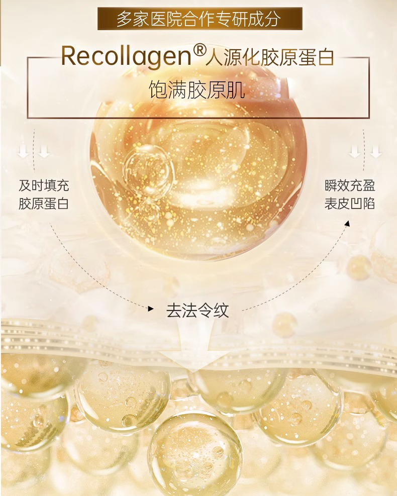 所以,去法令纹关键还得补足肌肤胶原蛋白,把皮肤“撑”起来、把水分锁足,好比年轻时的肌肤就肉眼可见的饱满、水润。