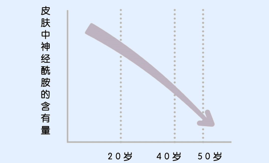而随着年纪增长,肌肤中神经酰胺含量会显著减少,50岁时仅剩20岁的一半。