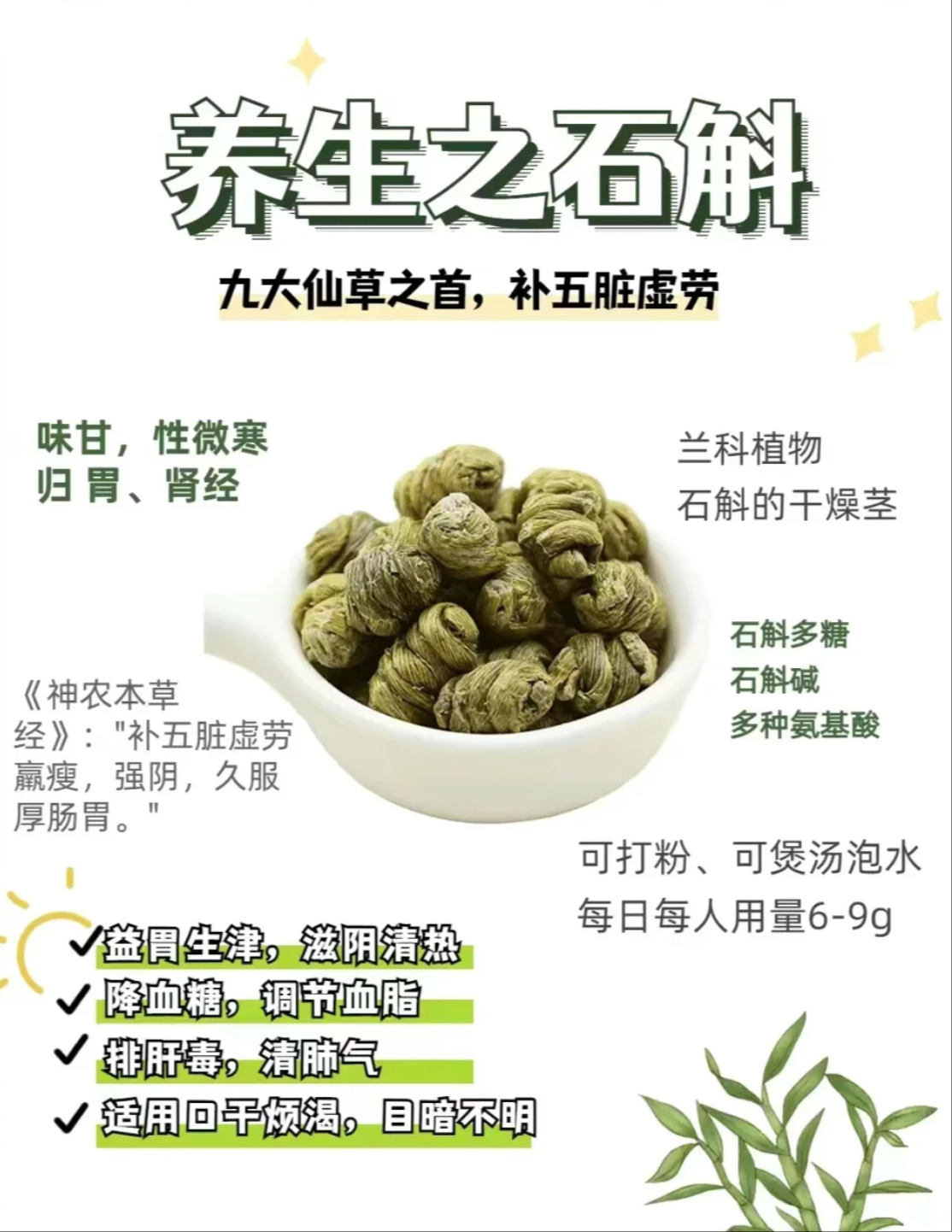 ⑤提高自护力:《神农本草经》记载石斛“补五脏虚劳,轻身延年”。