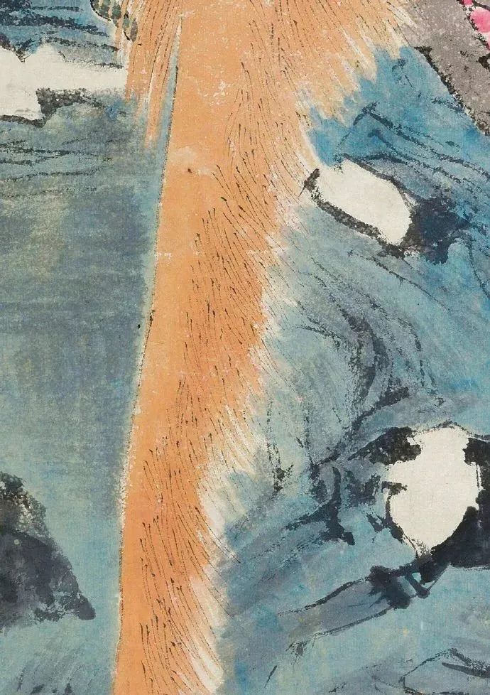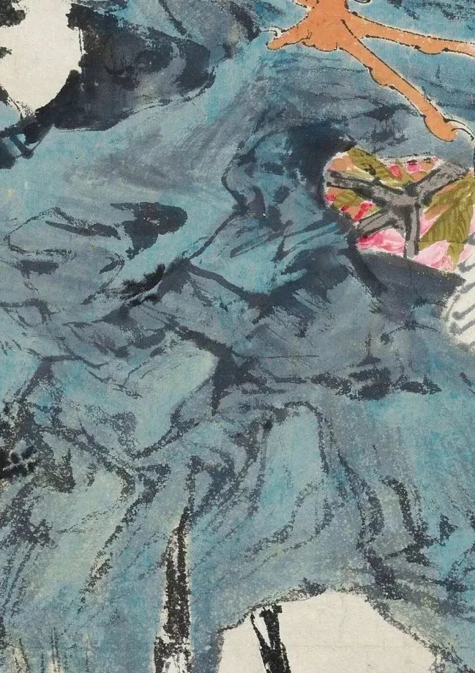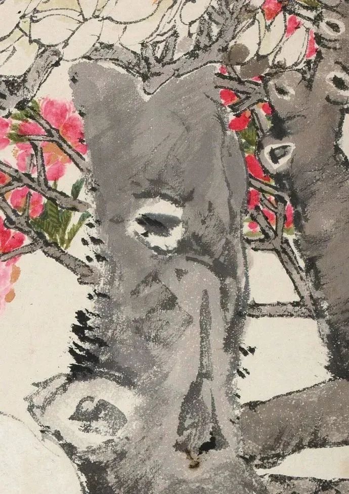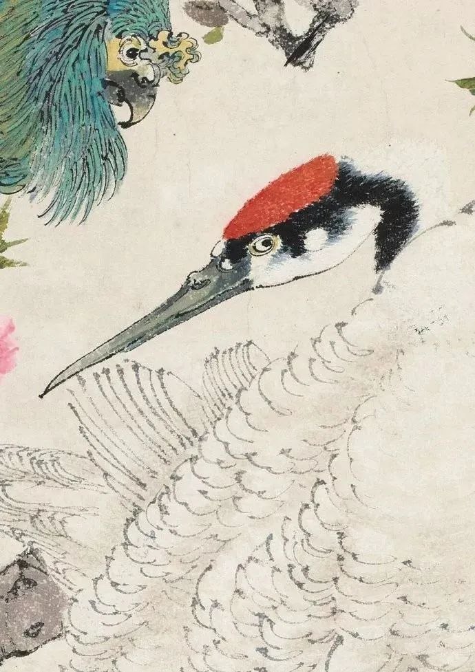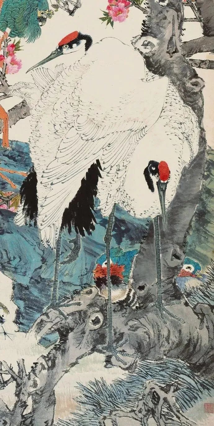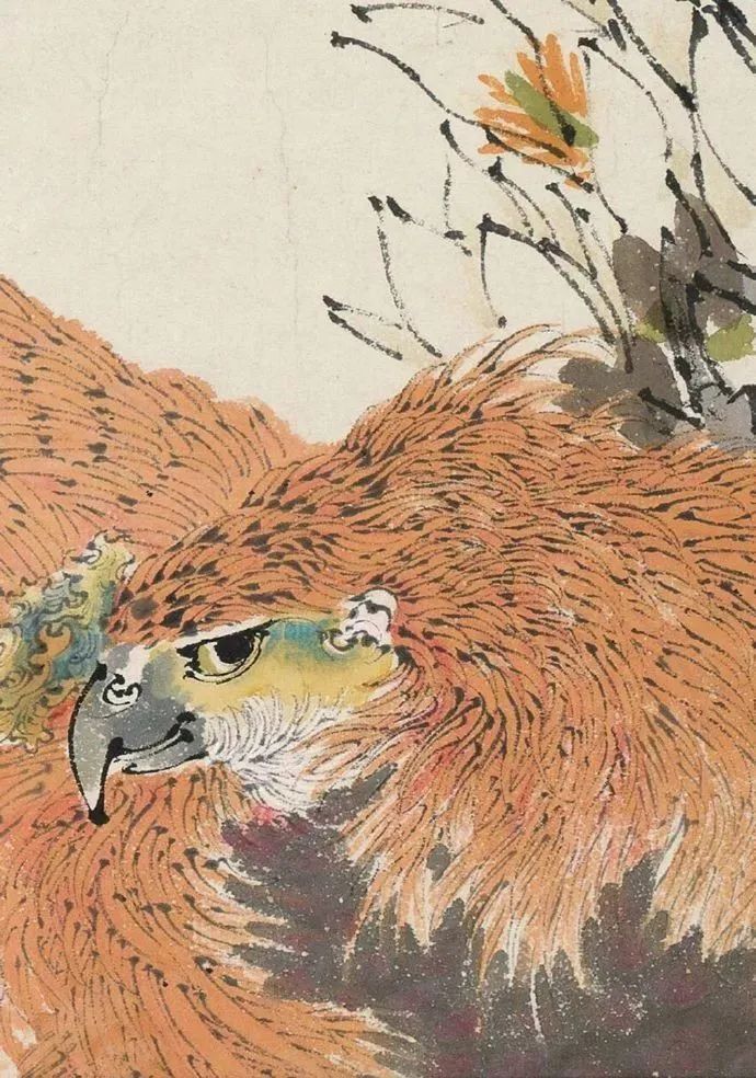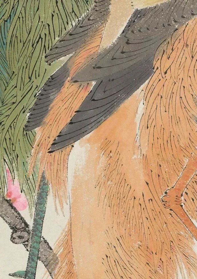此图写凤凰、白鹤、鸳鸯、黄鹂、白头五种瑞鸟,或立石上草间,或飞鸣于玉兰、碧桃花丛之中,画笔工细,形神毕肖。色彩绚丽,而不轻浮甜俗。构图繁密饱满而疏密有致,秩序井然,自有大家高华气象,无怪任阜长、张子祥、胡公寿都只能避退三舍,无一可与交量匹敌。