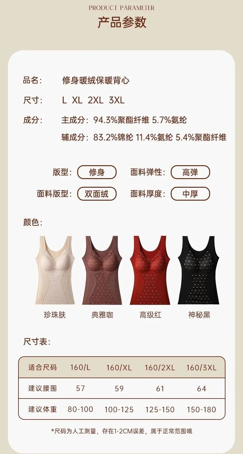 保暖背心360°贴身,前片收压设计,侧面反括号收腰设计。