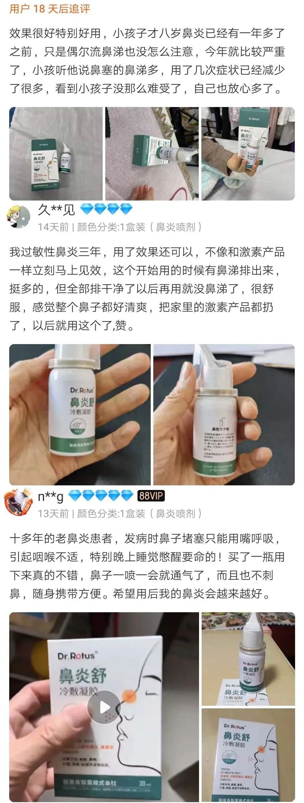 @小田吉美:每到季节相交就会打喷嚏,经常鼻塞流鼻涕;在乐天官网上购买了3瓶鼻炎舒喷雾,用了两次之后,鼻子就不再出鼻涕了,也不容易流鼻涕了,1星期后复查做了鼻镜,鼻腔粘液基本没有了!