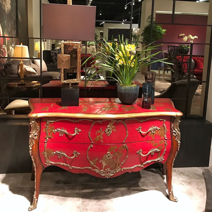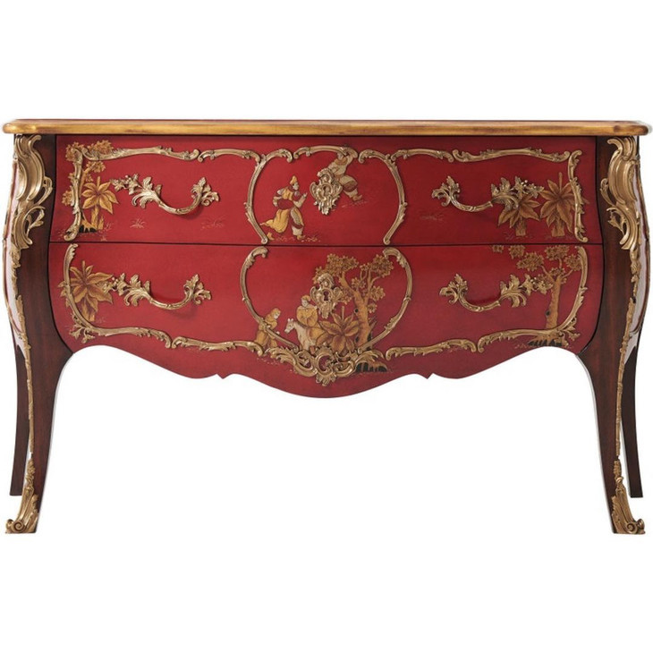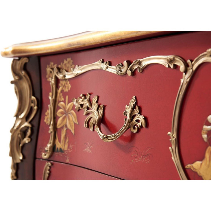 这款法式中国风的边柜带有浓郁的宫廷色彩,精工细作。边柜整体采用华丽的艳丽的红色油漆与金属浮雕搭配,中国工笔绘画成为点缀其中,充满华丽旖旎的风情。