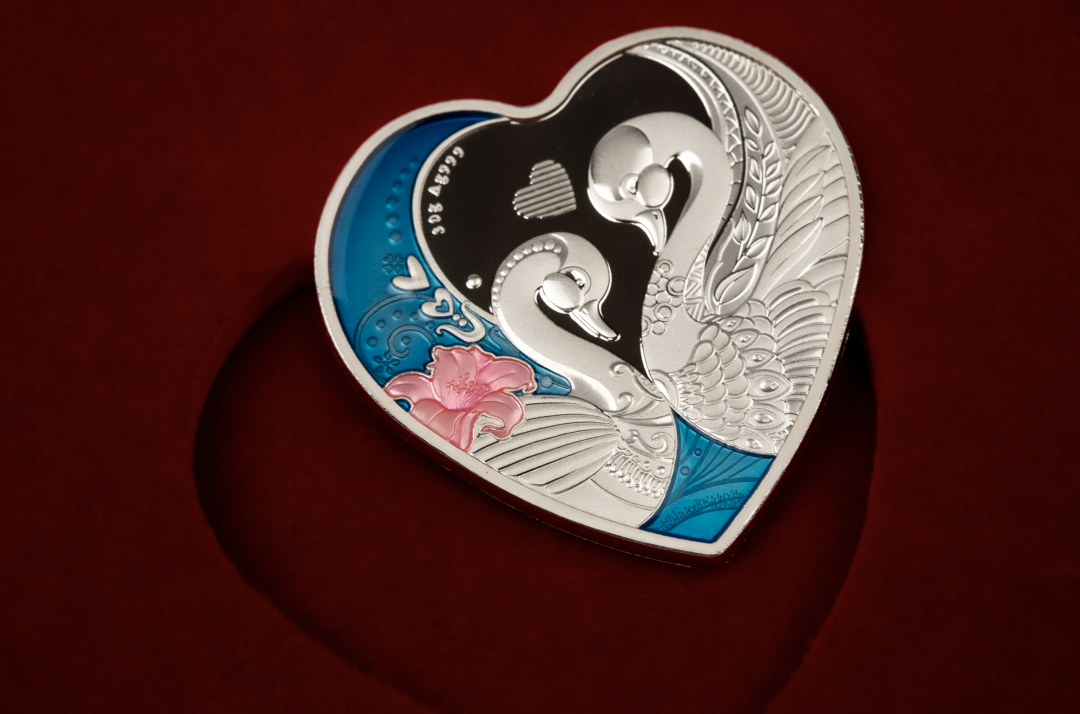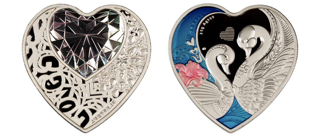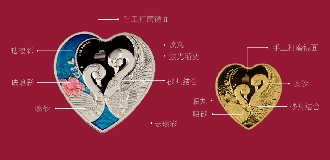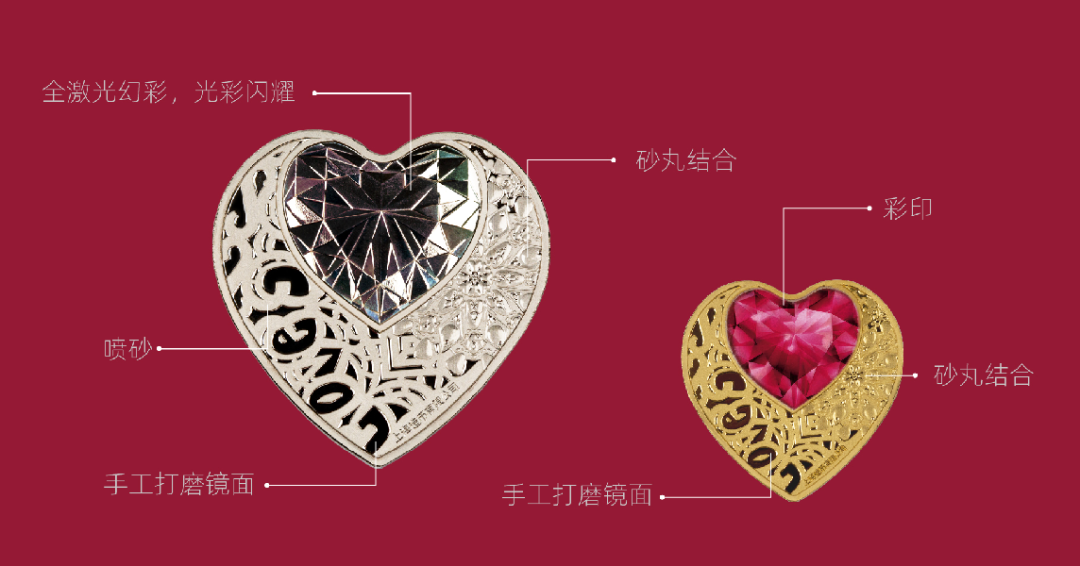 这套心心相印心形章,设计精美,融合了多种精湛的造币工艺,满满的细节值得品味!