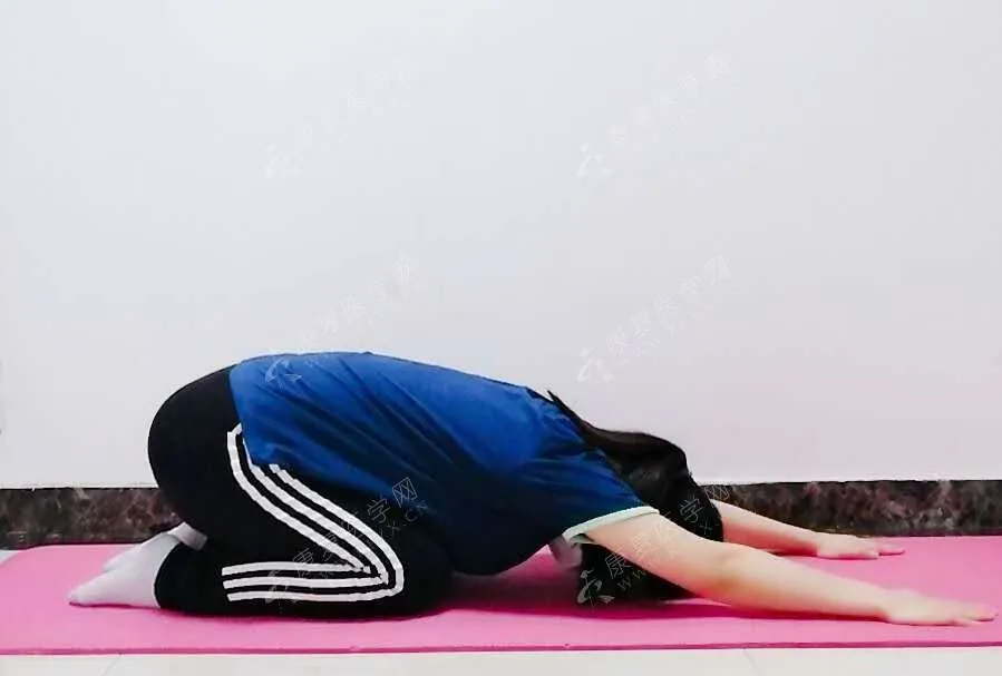 双腿跪在地上,两个手臂往前伸,上半身贴地臀部尽量往后坐,充分拉伸后背。坚持1分钟,直到症状缓解。