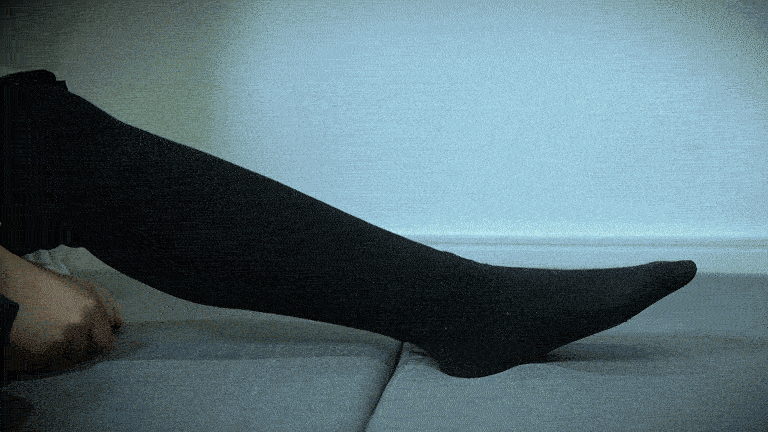 握住抽筋腿的脚趾,用力向上拉,用同侧手掌压在抽筋小腿的膝盖上,帮助小腿伸直。