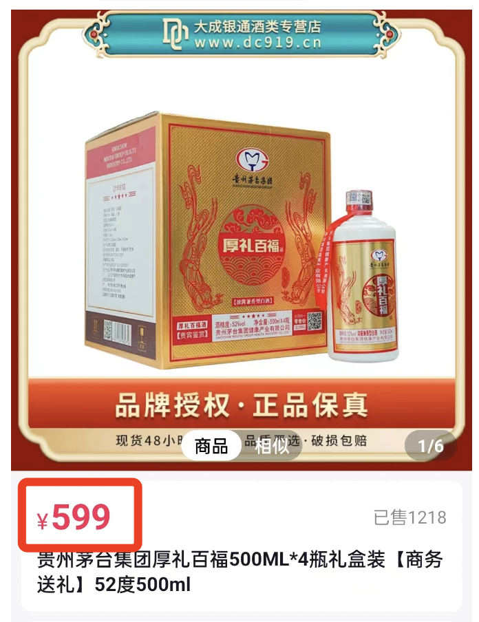 咱们百福酒也不例外,市场价一律都是一箱1598元,某宝活动价也要599元。