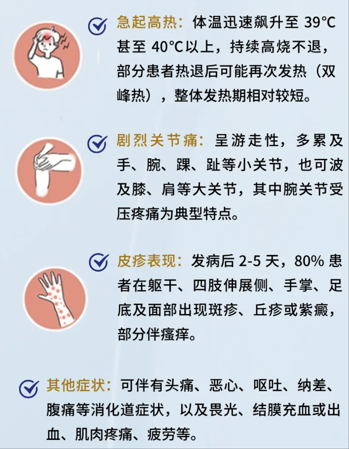感染的人会高烧发热、关节剧痛、长皮疹瘙痒,还有恶心呕吐、肚子疼等多种症状,发作起来超级难受。