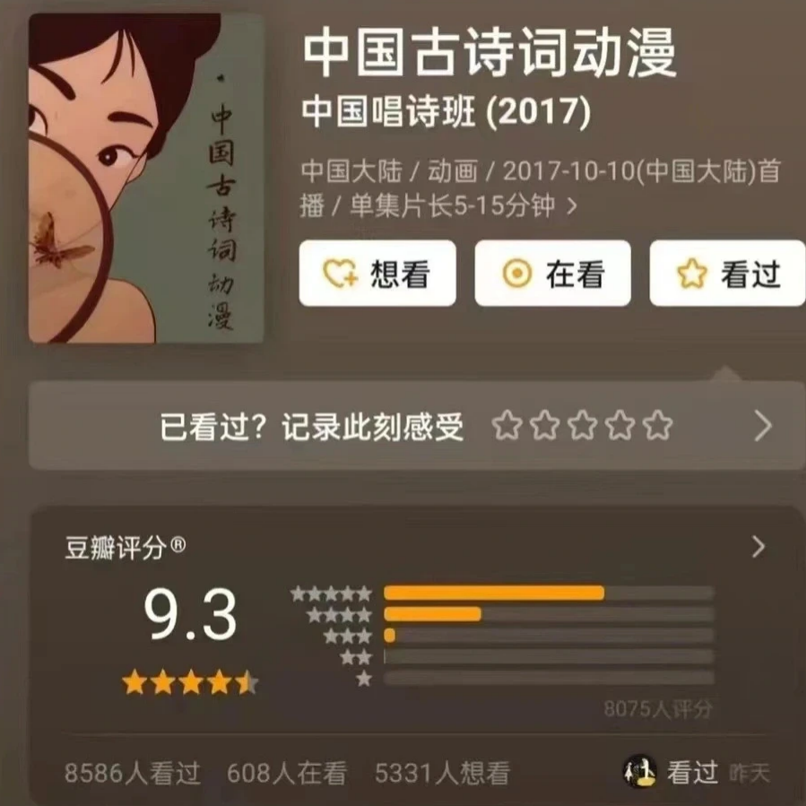 一系列以经典古诗词为背景的原创动画短片,如《相思》、《元日》等,用唯美的故事再现诗中的意境与情感。颠覆了死记硬背的古诗学习方式。其浓郁的中国风画面和动人的故事,能让孩子在美的熏陶中,真正“懂”诗、爱诗。