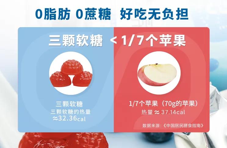 更贴心的是,虽然这是一款功能性软糖,但却做到了0脂肪0蔗糖,3粒软糖的热量只相当于1/7苹果,补充营养的同时完全没有负担!