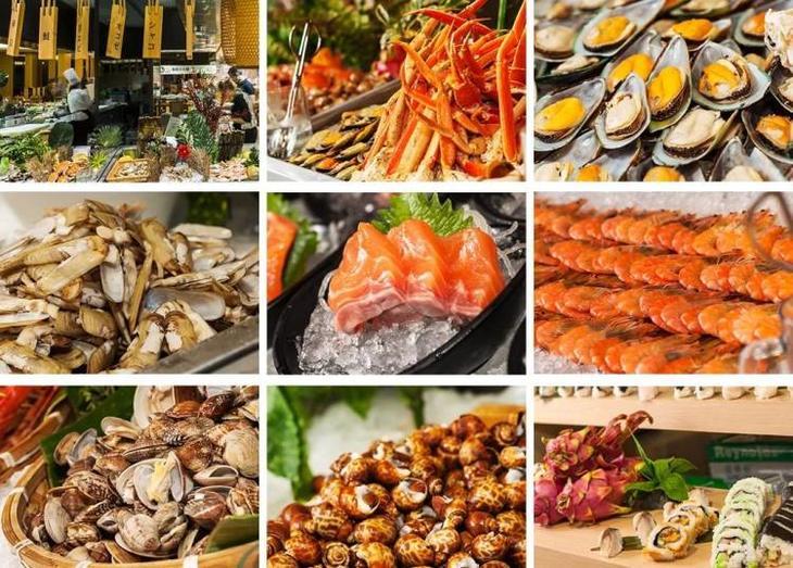 各种海鲜、冷热菜、烧烤类、三文鱼、寿司