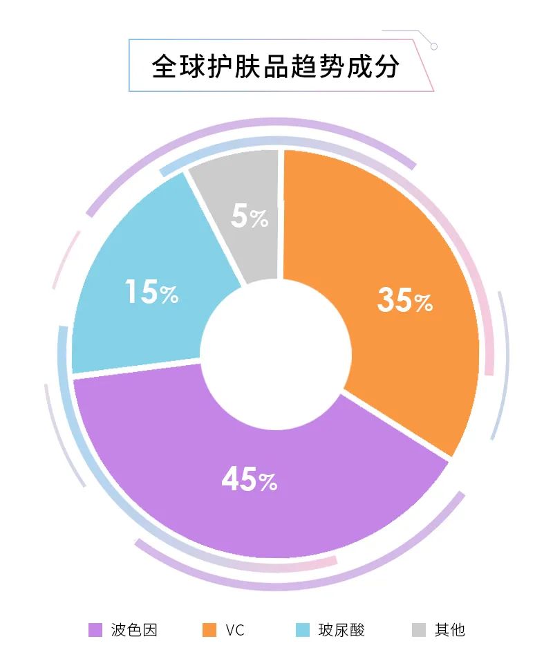 又经过全球44个实验室和100多家原料公司的分析调查发现,全球使用量和搜索量最高的三大成分依次为:VC、玻色因、玻尿酸。