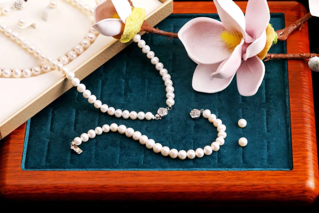 颗颗精挑细选饱满有光泽、瑕疵少、均匀的3A级天然淡水珍珠。