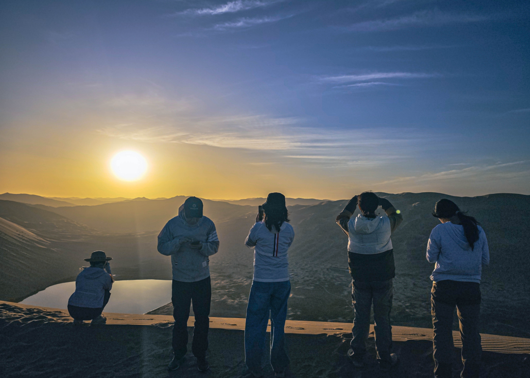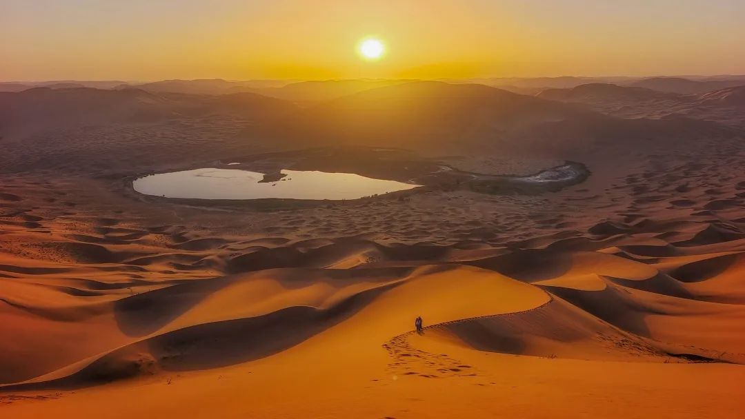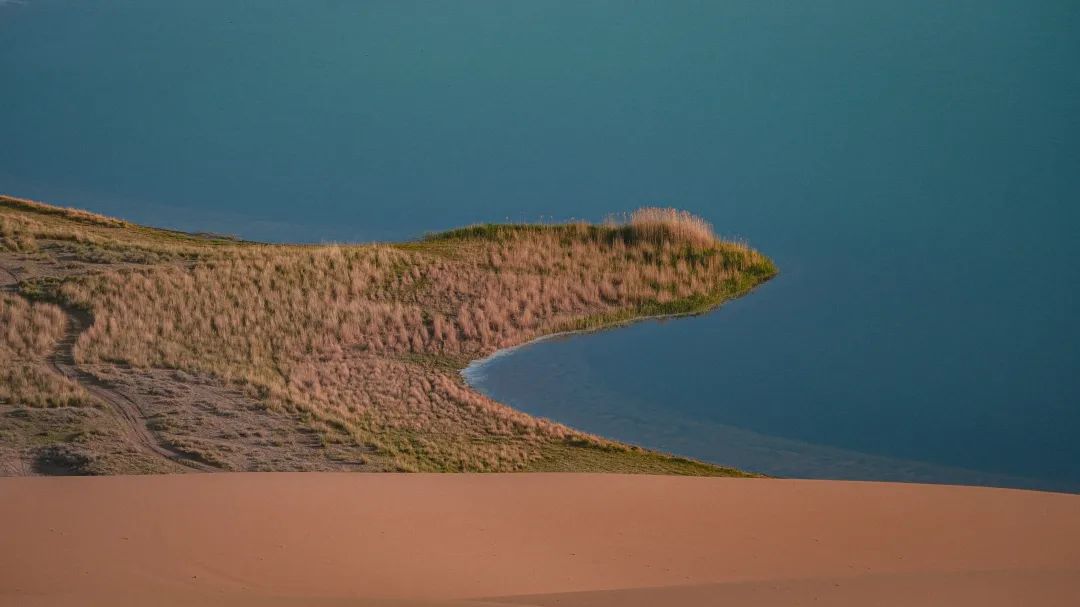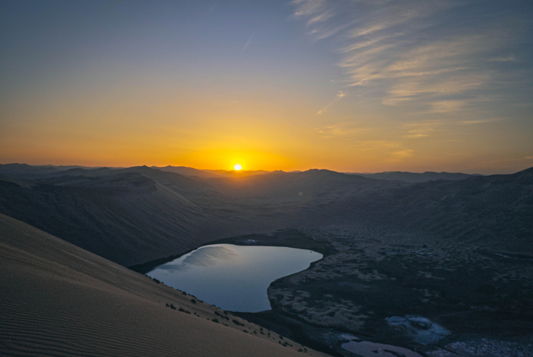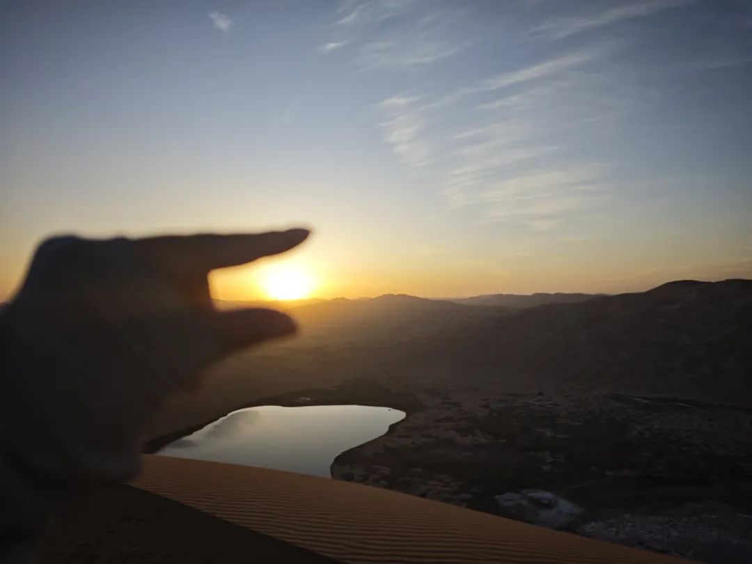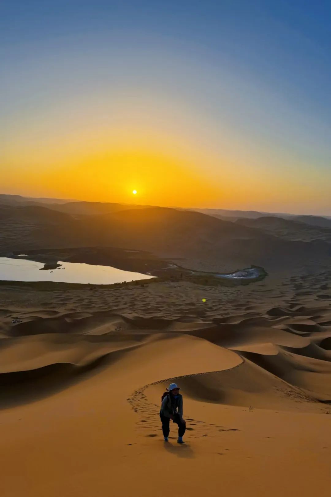 第一缕晨光探出地平线,沙漠开始苏醒,沙山下面的双色湖慢慢被晨光点亮,我们站在沙丘顶端,静静感受这份美好,看着自己的影子被晨光拉长,一直延伸到远处的沙地上。这场日出就像沙漠给我们盖上的最后一个邮戳,证明这段旅程的圆满。