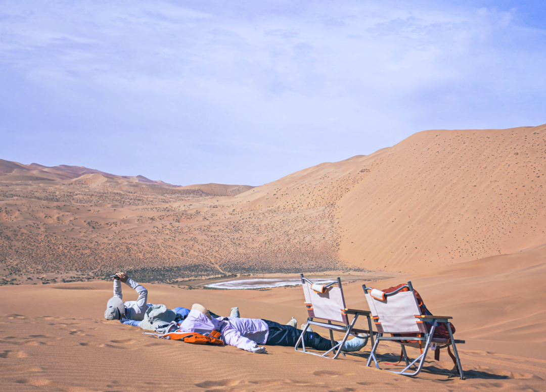 广东的队友解锁了"祛湿气式"徒步,有机会就往沙地上一躺,争取把岭南带来的湿气统统蒸干,时间充足甚至可以挖个小坑把腿埋进沙里,体验沙海spa。