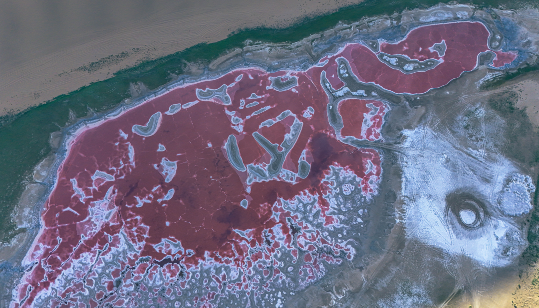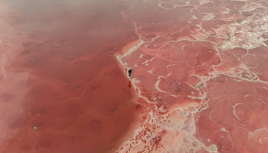 越过绿洲,走进粉红湖,湖面被分为大大小小的圈圈,像一块巨大的调色板被打翻了颜料。最外圈的湖水呈现出淡淡的粉色,越往中心颜色越深,从岸边沿着干枯的盐壳走到中间,踩上去会发出清脆的碎裂声。听说随着日照的变化,整个湖面的颜色会从清晨的淡粉色逐渐变成傍晚的暗红色。
